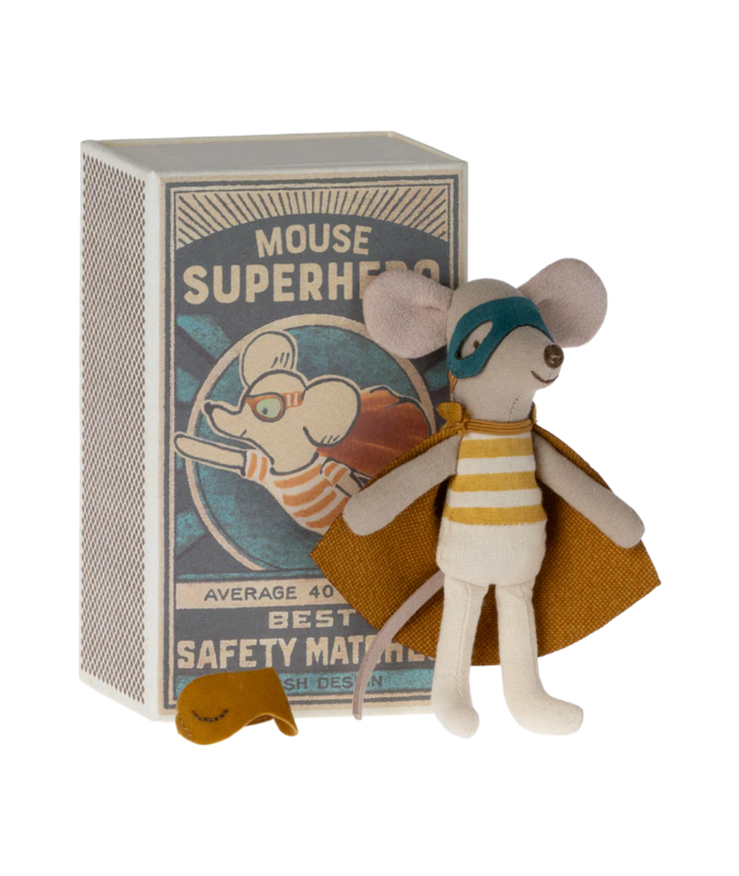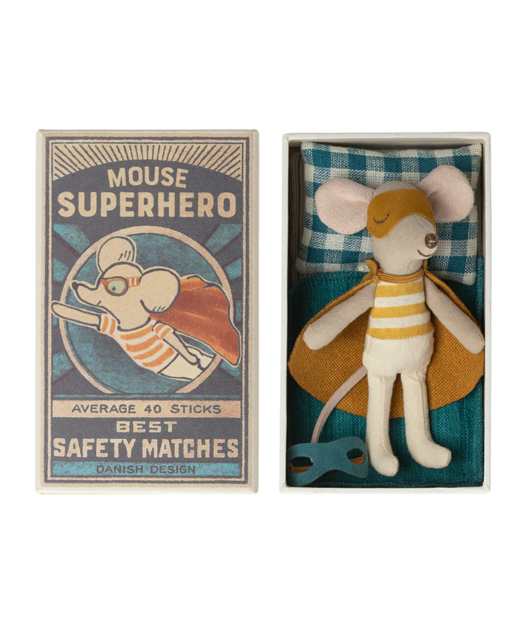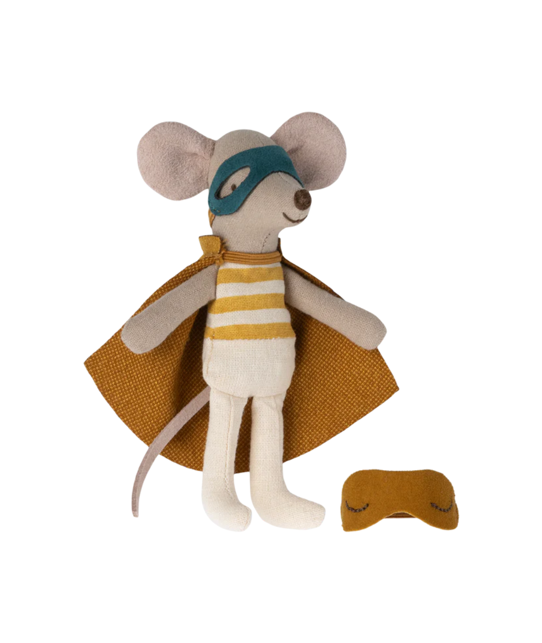 A classic Maileg item. This mouse is ready for hours of play and sleeps tight in a little matchbox. The clothes and bed linen come in unique prints and beautiful colors. Two face masks included - one for flying and one for sleeping.