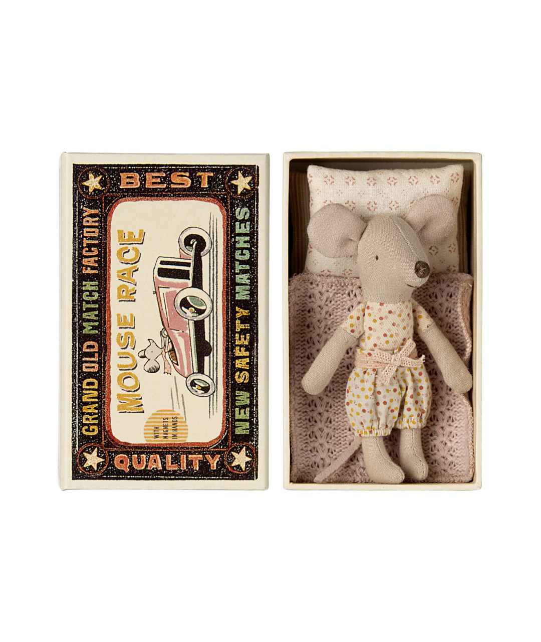 A classic Maileg item. This mouse is ready for hours of play and sleeps tight in the little matchbox. The clothes and bedlinen are made of soft fabrics with unique prints in beautiful colors. Extend the story by adding accessories to the play.