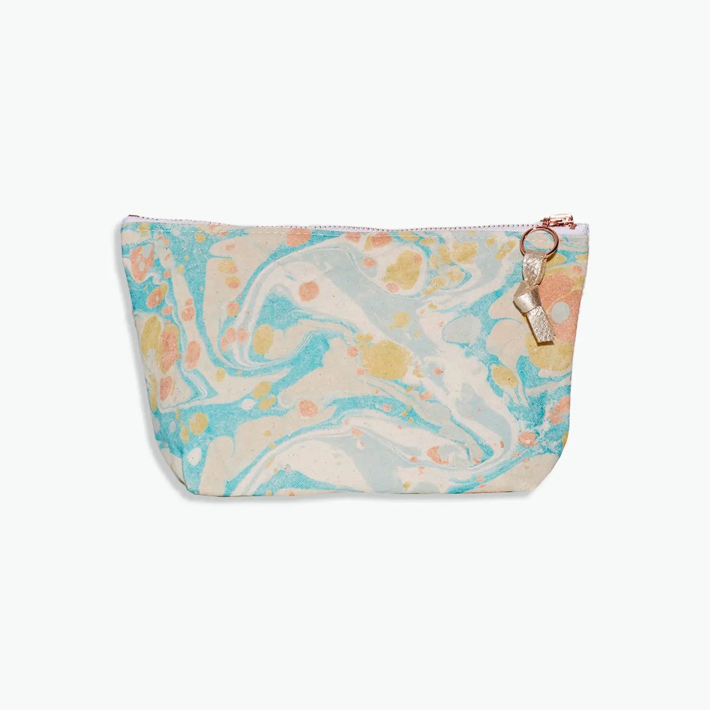 Hand marbled panels of mill end cotton canvas are done in studio and then sewn into these marvelous canvas pouches perfect for all sorts of objects and accessories, or to use as a cute clutch.
