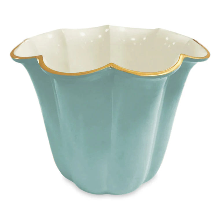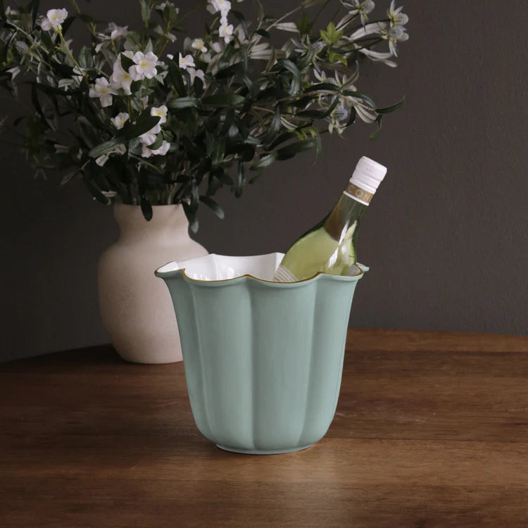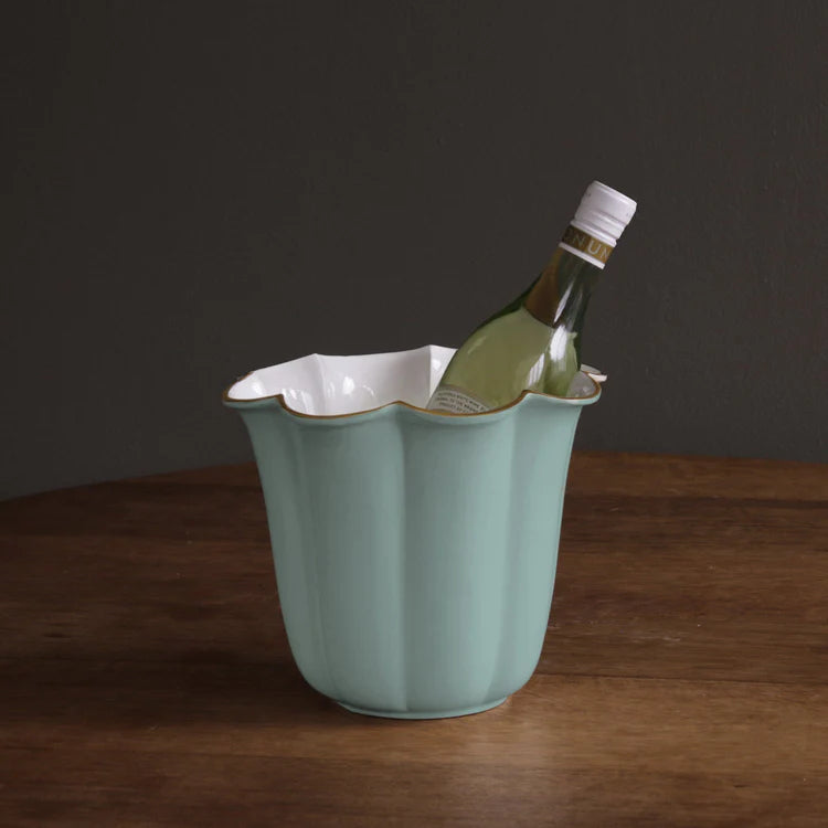 An essential ice bucket in a lovely turquoise. The striking fluted form of Beatriz Ball's Encanto Devon Large Ice Bucket in turquoise and white is a perfect match for today's lifestyles. Notable for its tailored styling, and brilliant two-tone finish rimmed in gold, this ice bucket is an awesome design that is as practical as it is decorative. Ideal for serving ice or chilling wine.