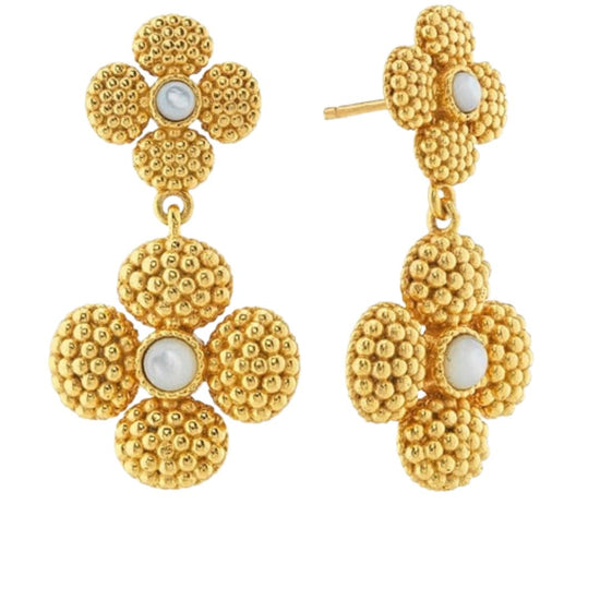 Capucine de Wulf's signature golden berries are clustered together in 4-leaf clovers so you can carry a token of luck everywhere you go. With luminous mother of pearl centers, this pair of earrings can be easily converted to just the studs by removing the bottom clover—making this set a gorgeous and gilded two-for-one. Lucky you!
