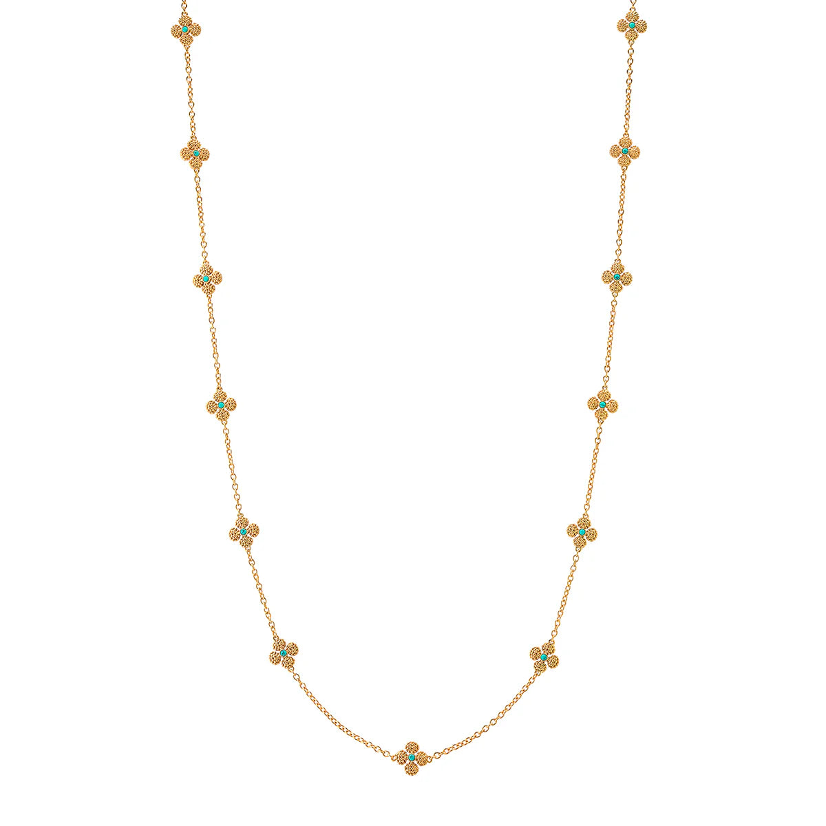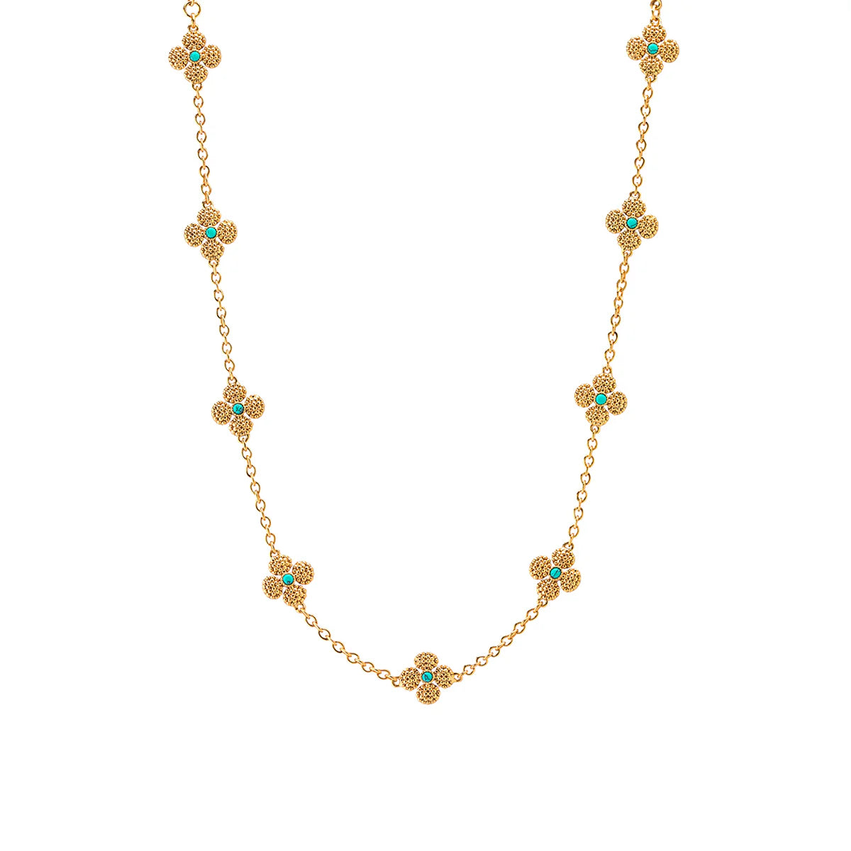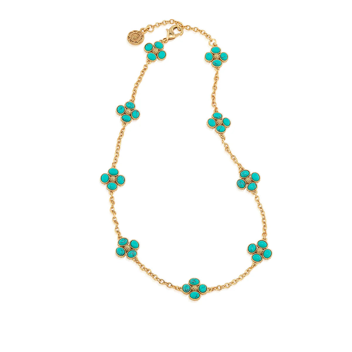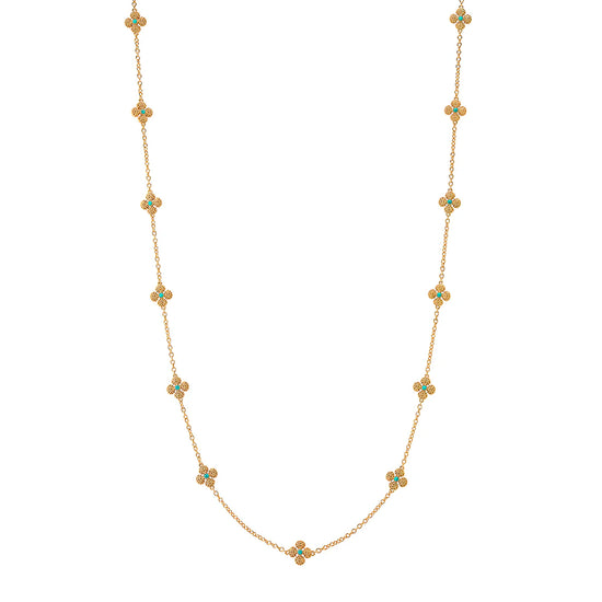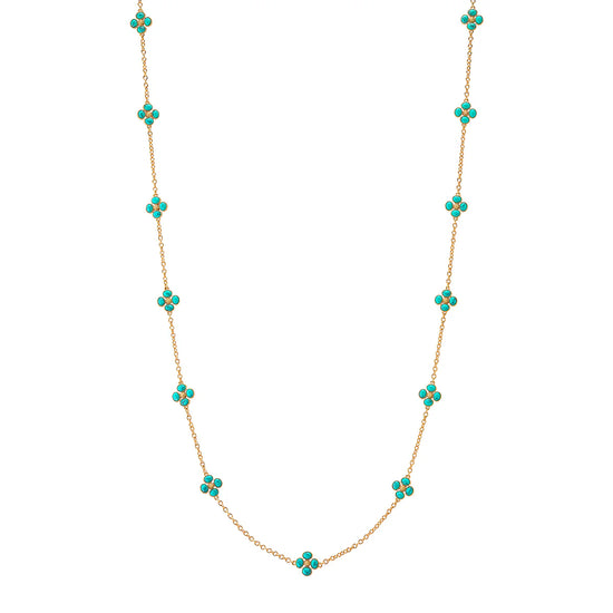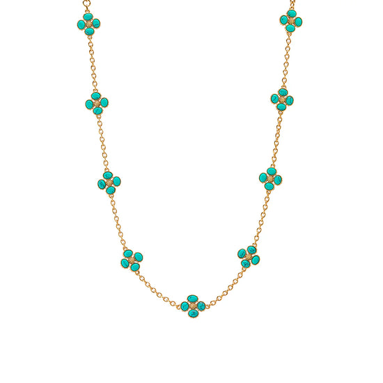This dainty, double-sided station chain necklace is a vision in bright, gleaming gold and turquoise blue, interspersed with our clever double-sided clovers that playfully flip throughout the day—from turquoise clovers with golden berry centers to golden clovers with turquoise centers.