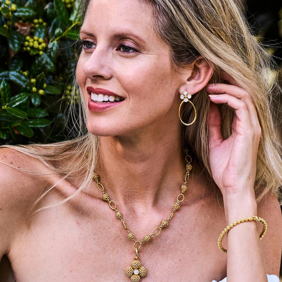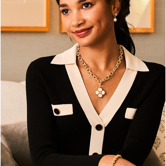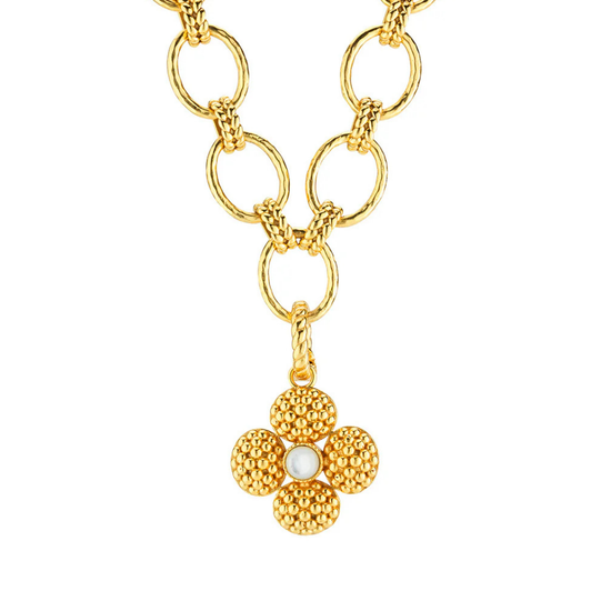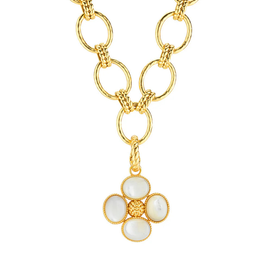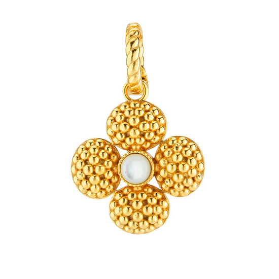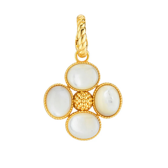 Add a beautiful token of luck to any chain to carry with you wherever you go. This clover pendant is made with luminous orbs of natural mother of pearl with intricately detailed golden accents and a gilded berry center. This ornate and elegant piece makes a fabulous gift for someone special (including yourself)!