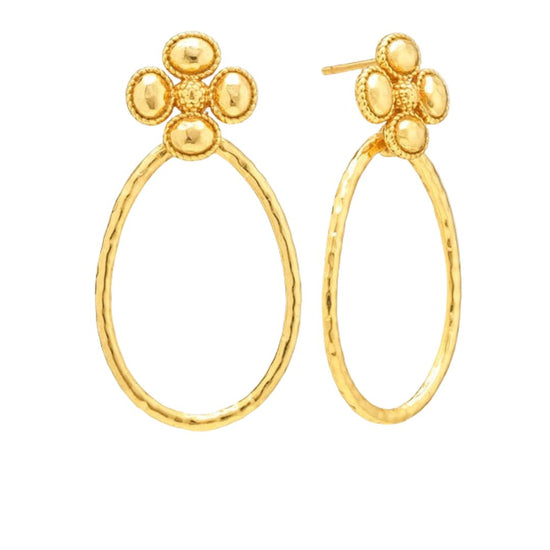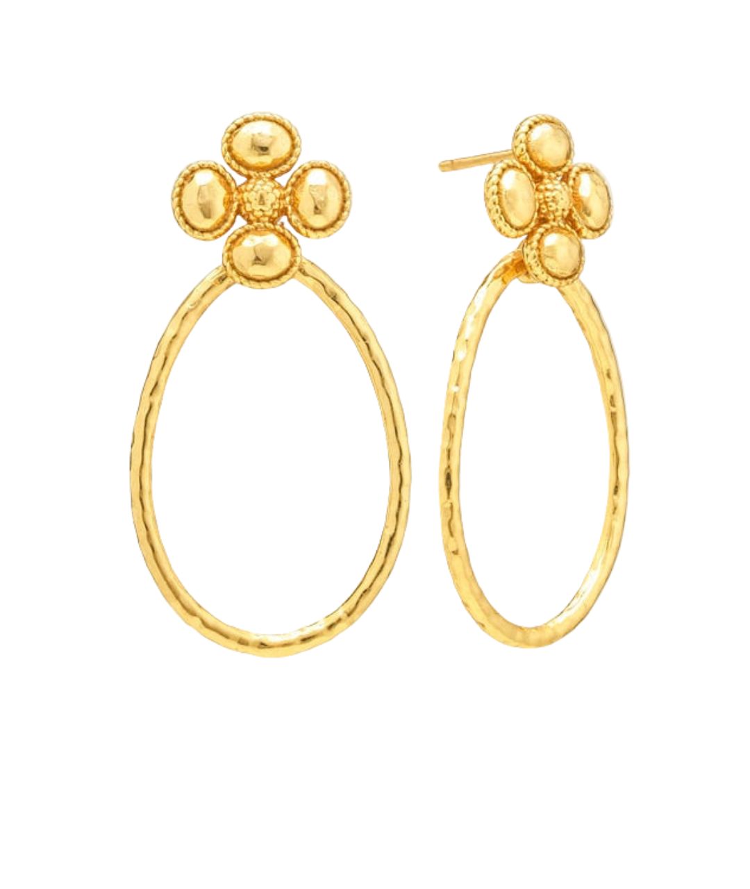 Teardrop hoops of shimmering hammered gold dangle from clover-shaped studs with sweet little berry centers. With understated elegance, this irresistible pair of earrings knows precisely how to make a subtle statement, whether it’s a day at the office or a night out on the town. Lucky you!