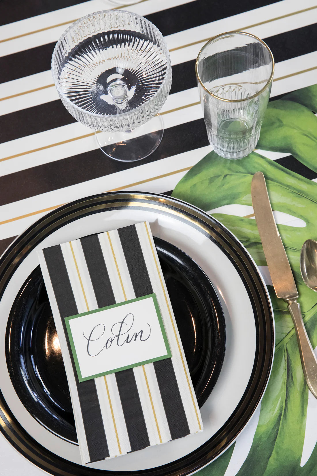 These elegant Black & Gold Awning Striped Napkins are a sophisticated addition to any gathering! Pairs beautifully with any of our tabletop products featuring gold and black.