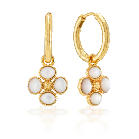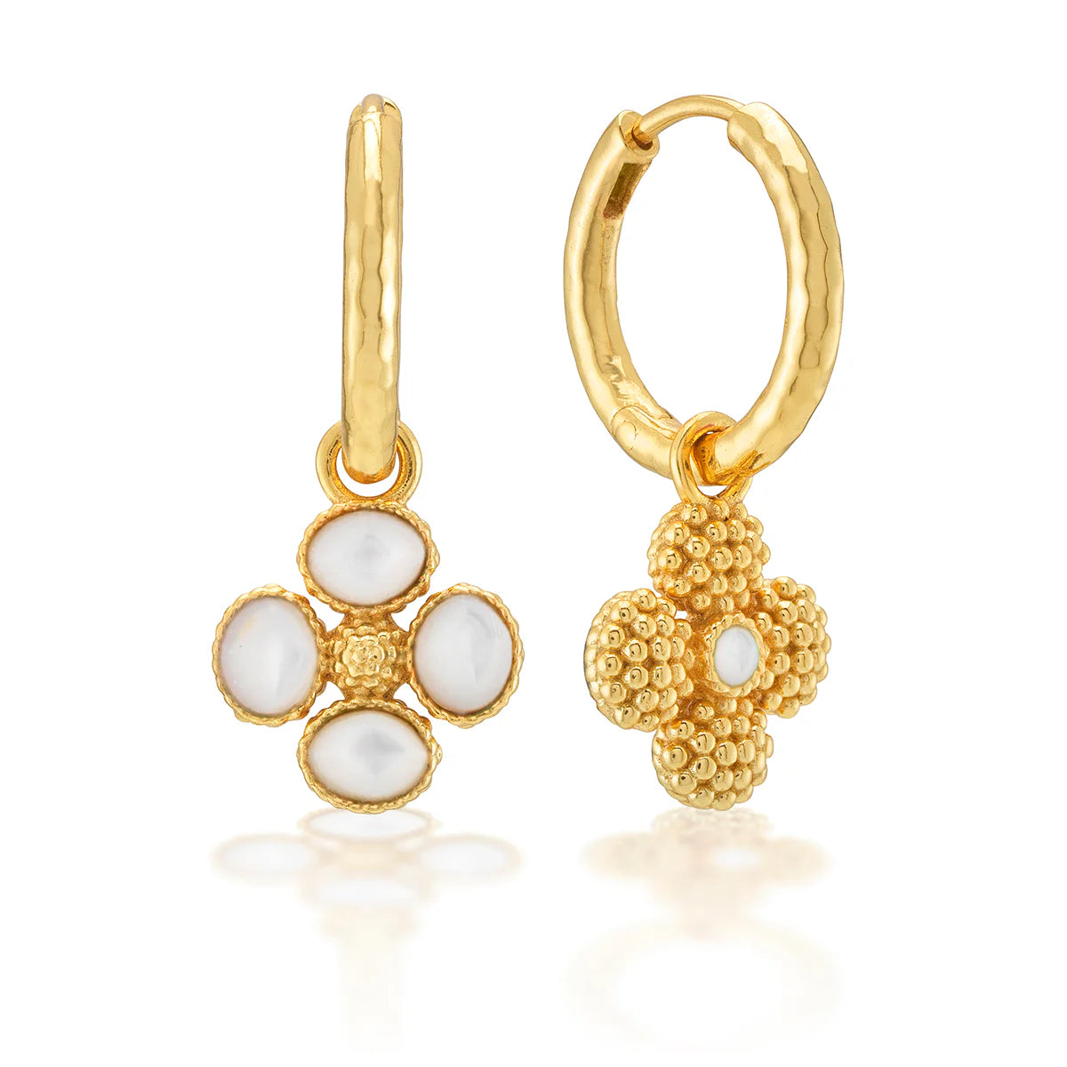 Classic hoops in hammered gold dangle our exquisitely detailed clover charms that are cleverly double-sided so you can choose how you wear them—gilded berry exterior with mother of pearl center or mother of pearl exterior with gilded berry center (or a combination)! Whichever clover you pick, the result is subtly stunning, romantic and unique. Lucky you!