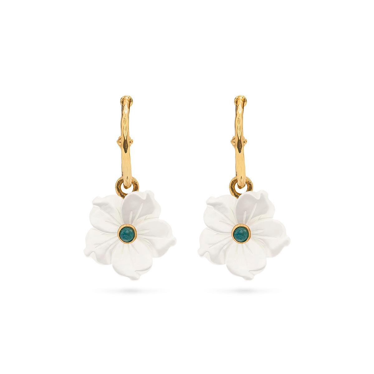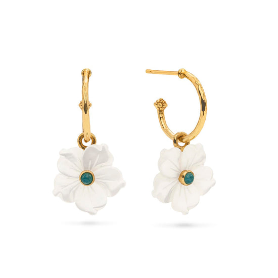 Add a touch of whimsy to your style with Capucine De Wulf's Mermaid Garden Hoop Earrings. The delicate mother of pearl flowers sway playfully from the golden hoops, bringing a touch of charm and iridescence to any outfit. Perfect for any adventure, from the boardroom to a bridal party.