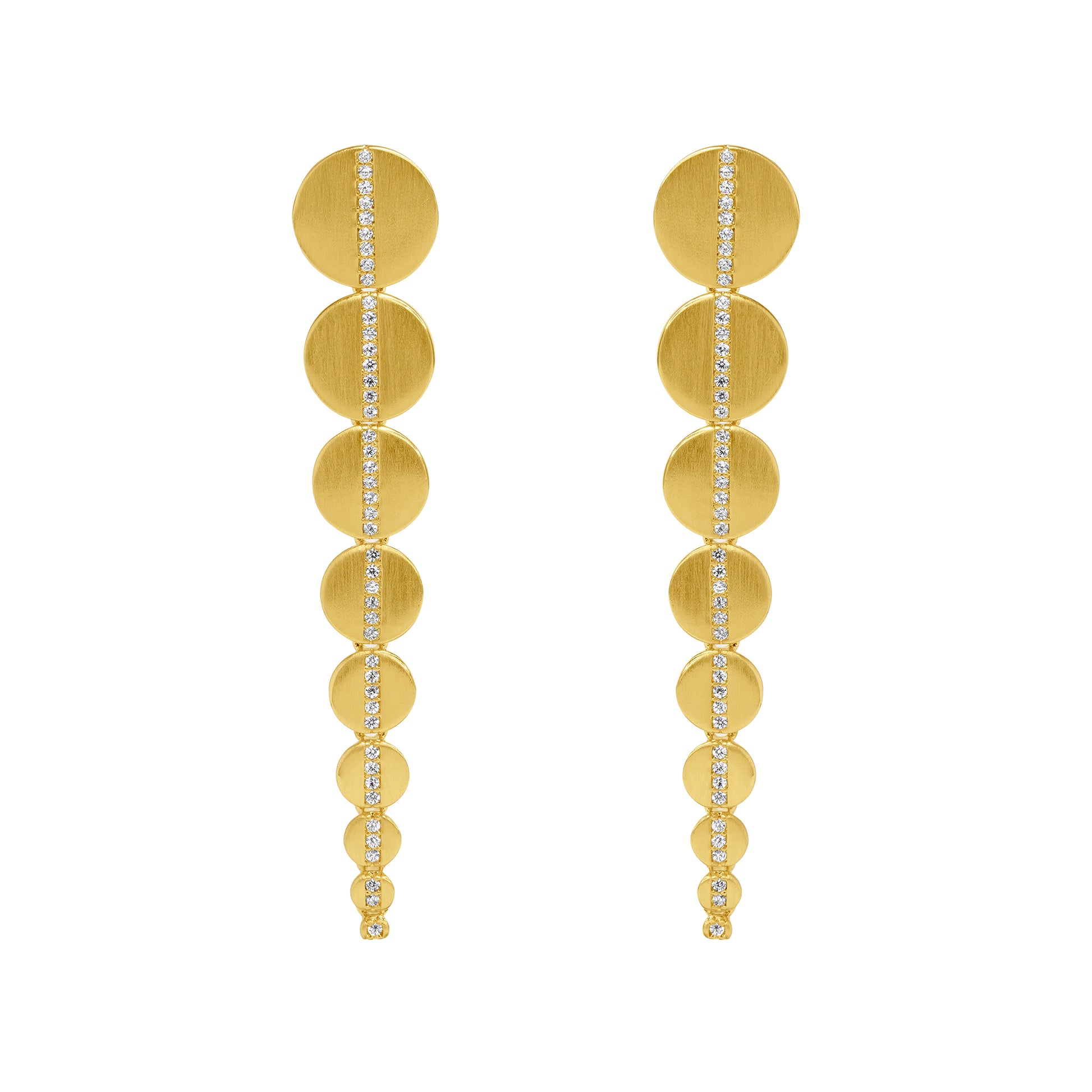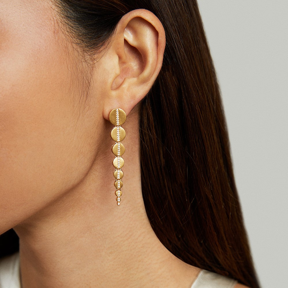 Nine brushed gold discs, descending in size, and connected by a delicate stream of expertly-cut cubic zirconias. Featuring Dean Davidson's signature brushed 22K gold finish over brass, this fluid style moves and sways with ease.