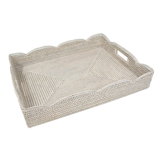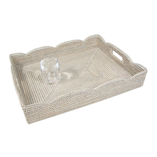 Add a touch of eco-friendly charm to your tabletop with our handwoven and lacquered Rattan Scalloped Large Tray.