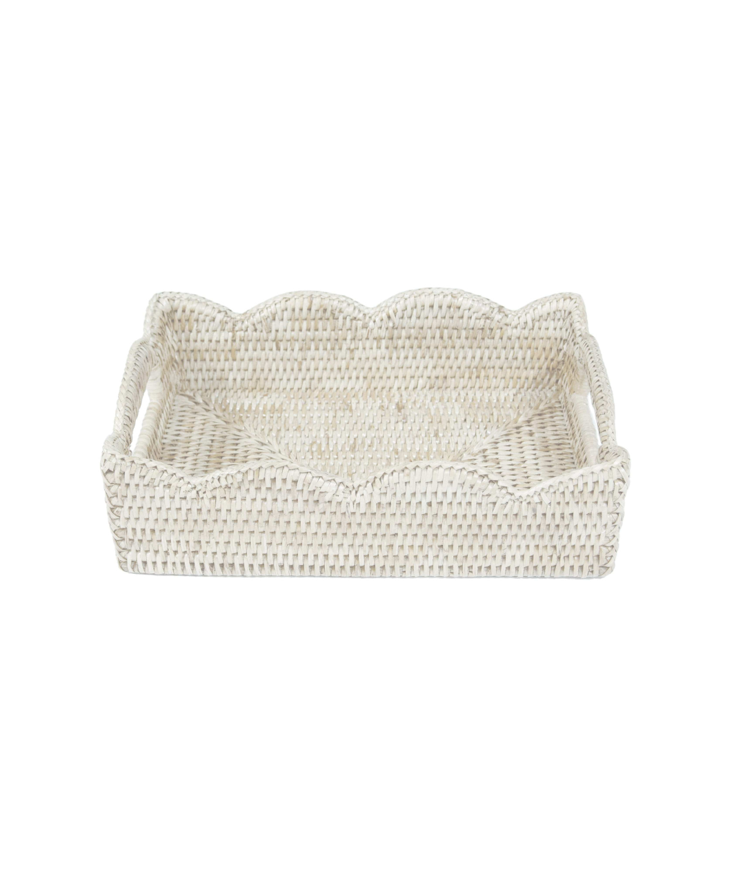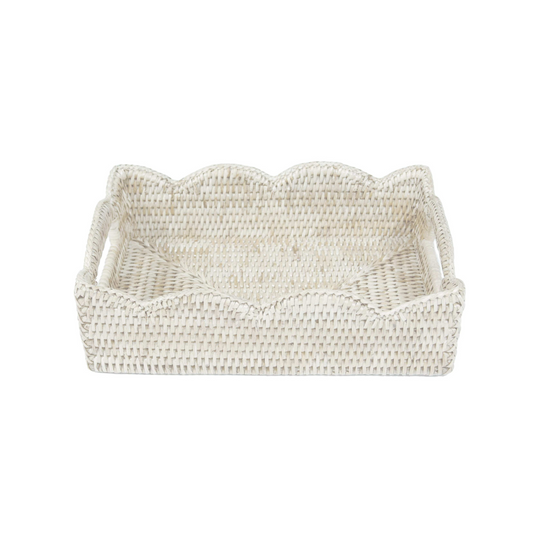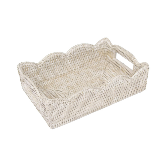 Add a touch of eco-friendly charm to your tabletop with our handwoven and lacquered Rattan Scalloped Large Tray.
