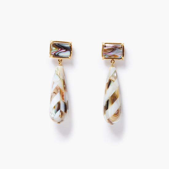 These eye-catching drop earrings feature color-shifting abalone shell posts and handcrafted mosaic abalone teardrops.