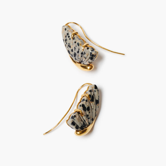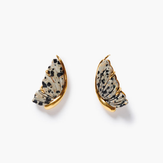 Hand-carved butterfly wings crafted from Dalmatian jasper are the centerpiece of these gold French wire hook earrings.
