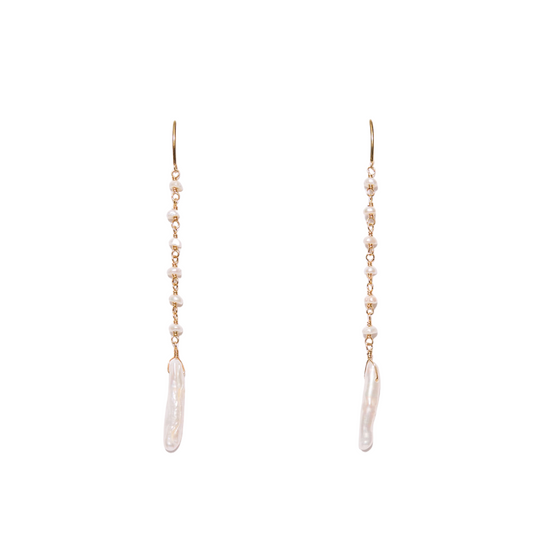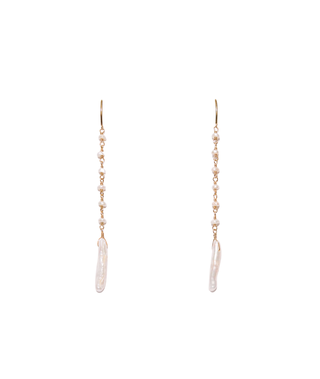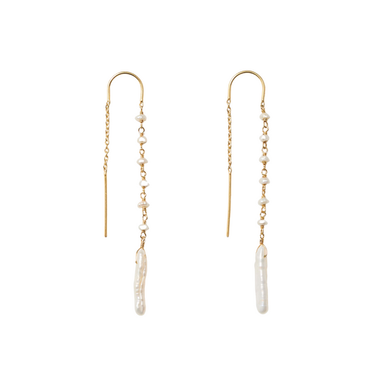 18K gold plated sterling silver thread through earrings featuring freshwater pearls. 2 1/4in. drop.