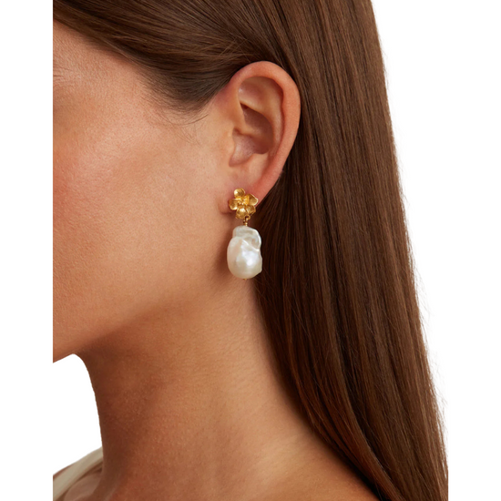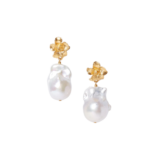 A tropical vibe emanates from artisan-crafted gold hibiscus studs with a luminescent baroque pearl drop.