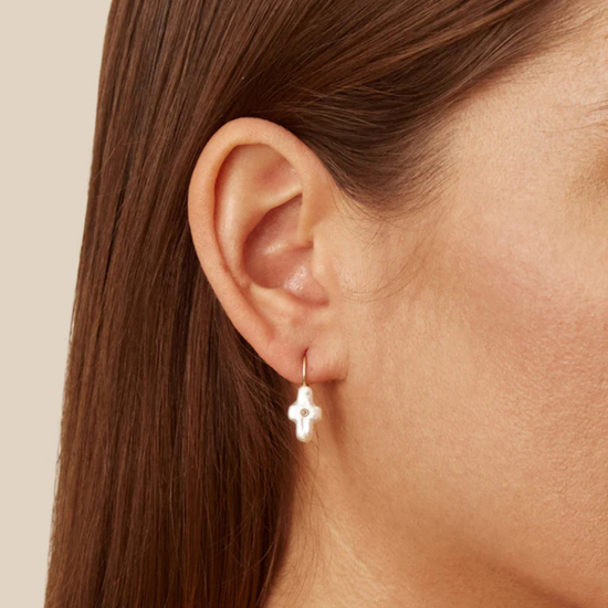 Bask in the warmth of the tropics with these beachy earrings featuring iridescent pearl cross beads with a 1mm rose cut champagne diamond inlay on 14k gold French hooks.