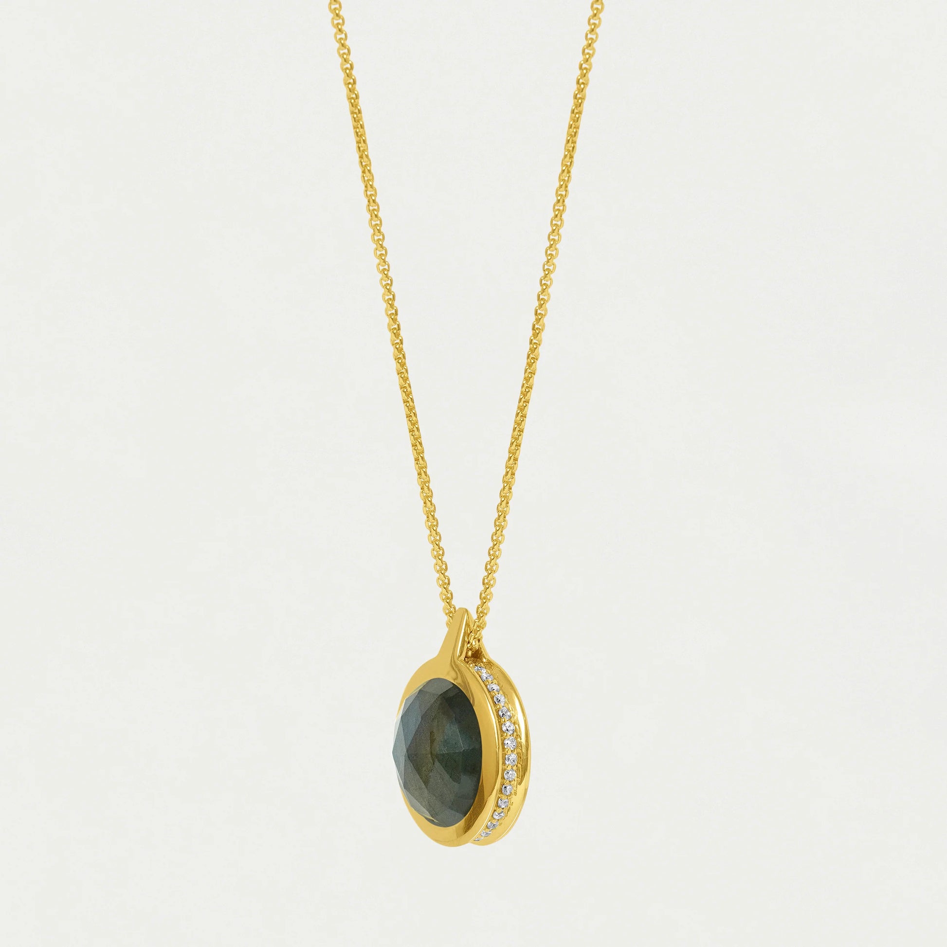 Imbued with endless styling potential, this double-sided pendant features faceted Labradorite and Rainbow Moonstone gemstones with Pavé detailing. A statement on its own, this piece also plays well with other stackable chains.