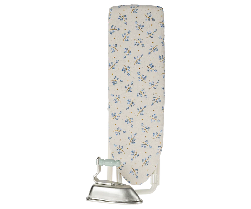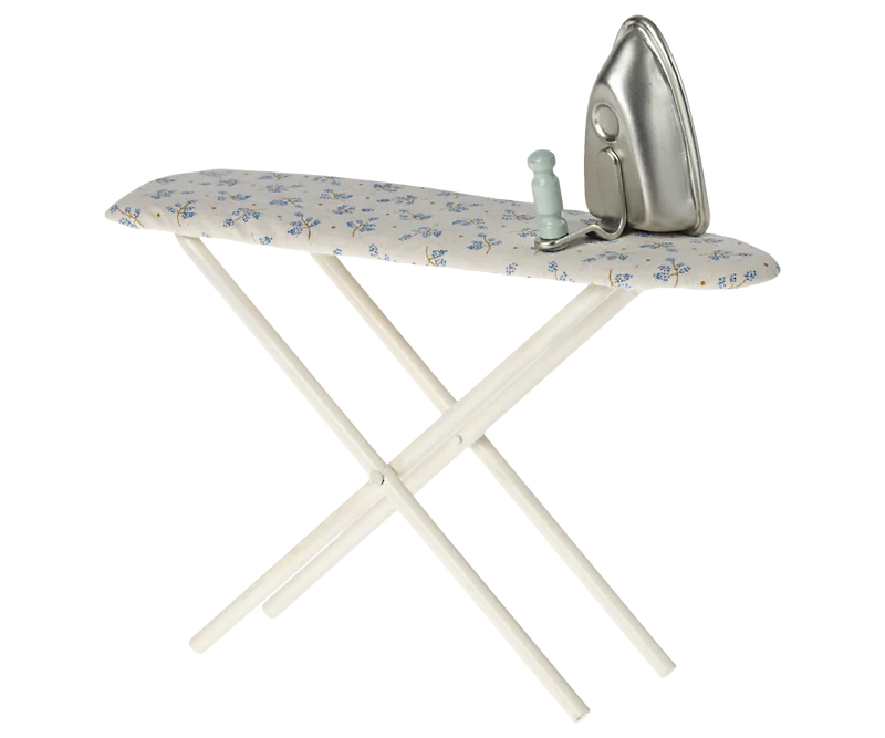 Our Iron and Ironing Board are perfect for our dollhouse. The new design includes a beautiful blue floral fabric on the board, with metal legs that actually fold up like a real ironing board.