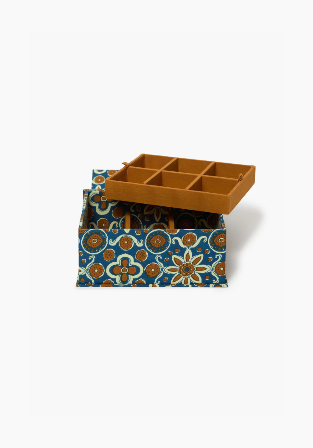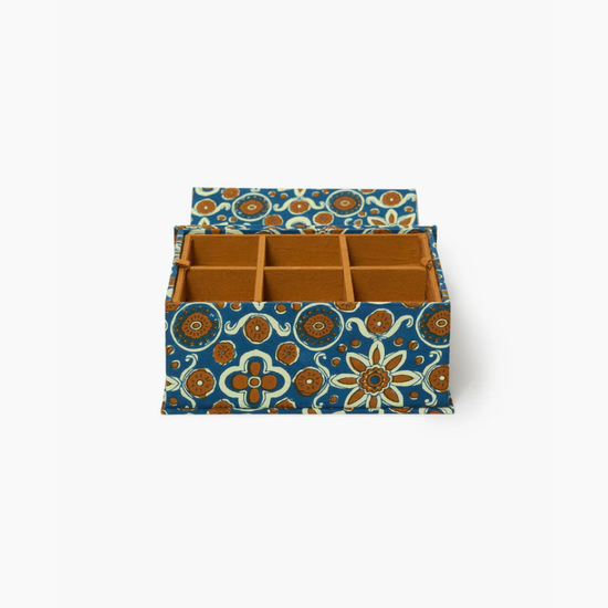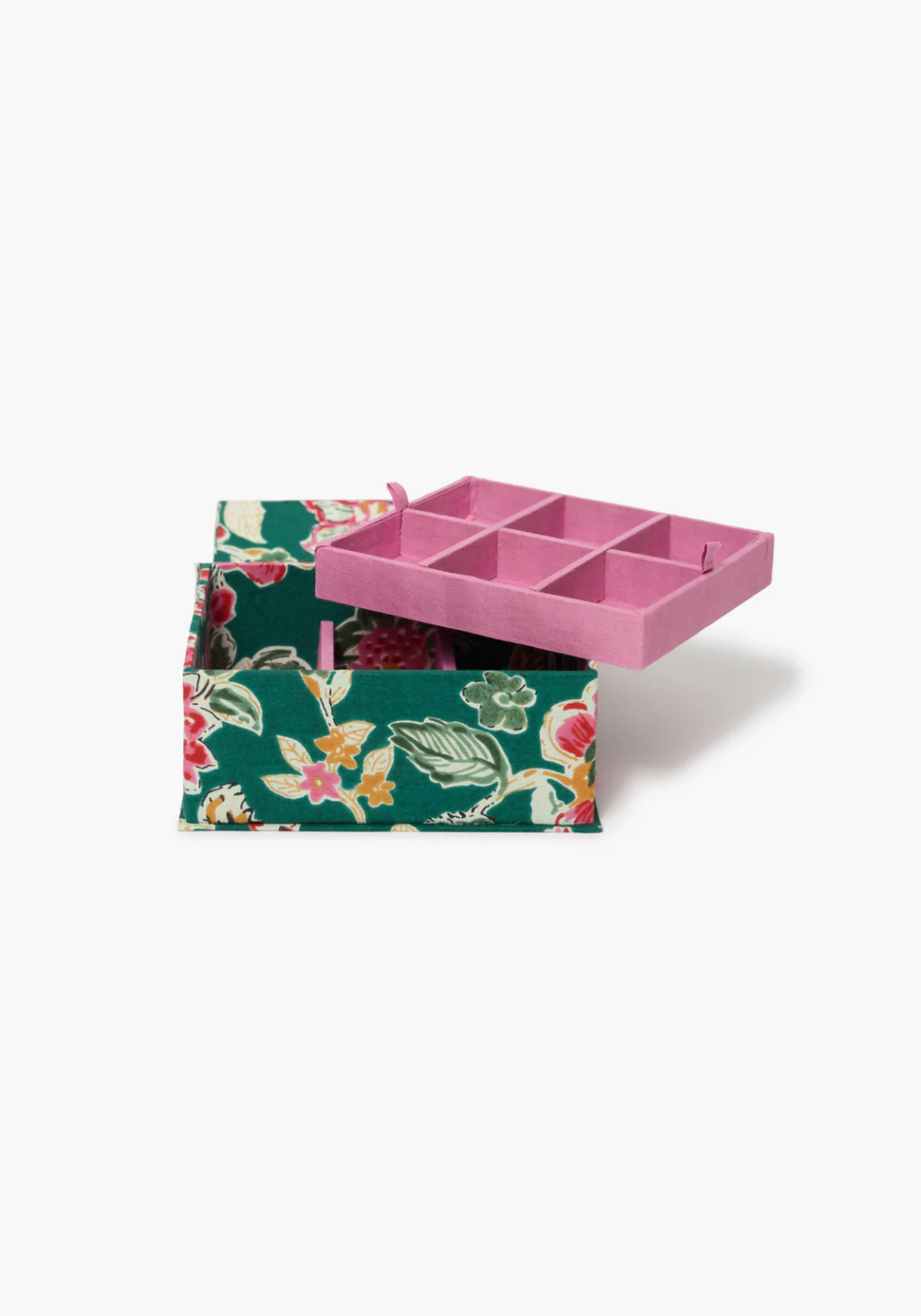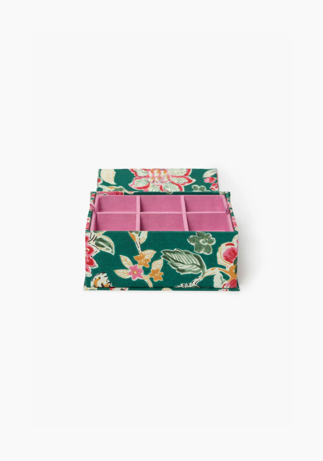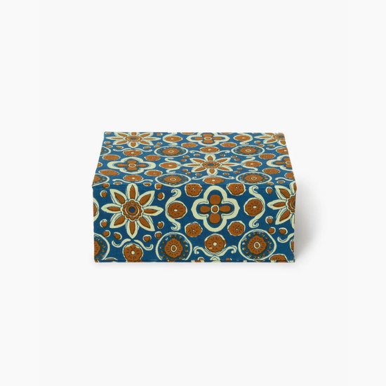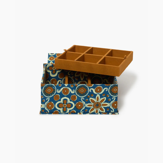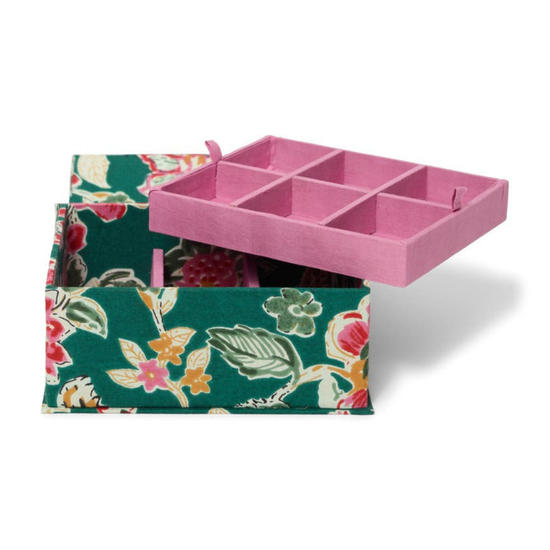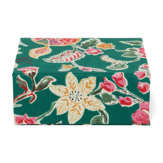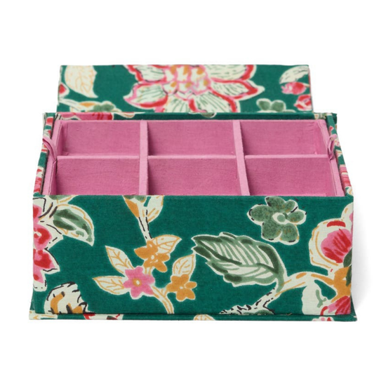 Made from cotton with a hand-printed floral design, this jewelry-organizer box is a beautiful and functional way to store your collection.