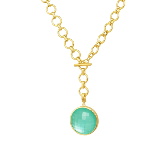 The Knockout Collar features a brilliant-cut gemstone suspended elegantly from a bold link chain, secured with a signature DD toggle. Designed for versatility, the gemstone charm can be removed, and the piece can be styled as a lariat, worn front to back for multiple striking looks.