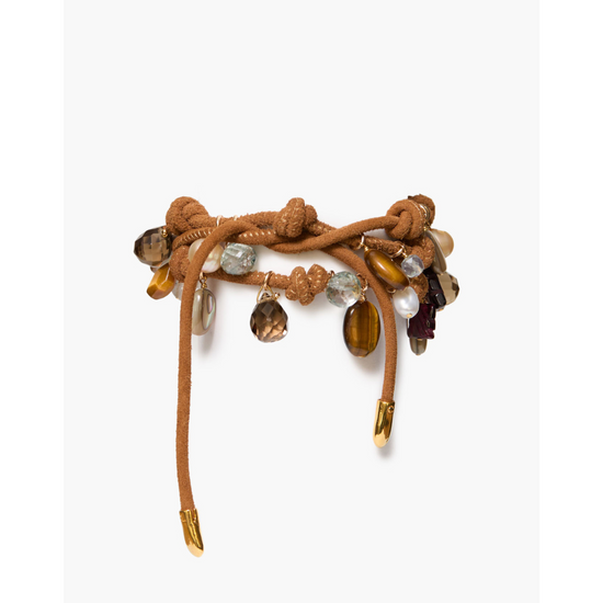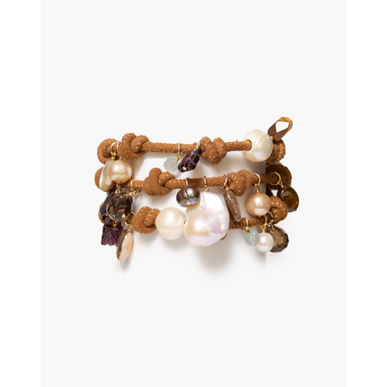 Freshwater pearls, abalone, tigers eye, garnet, aquamarine, smokey quartz on stitched leather cording with 18k gold plated sterling silver cap ends. 29in. length. Adjustable.