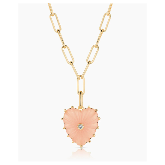 This super adjustable paperclip chain is elevated to new heights with our Malene heart charm in pink jade. Hand-carved stone, cubic zirconia, and high-shine gold. Everything you want and need in a statement necklace.