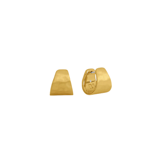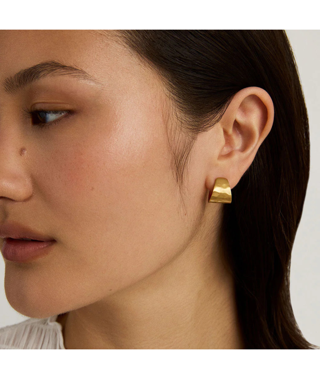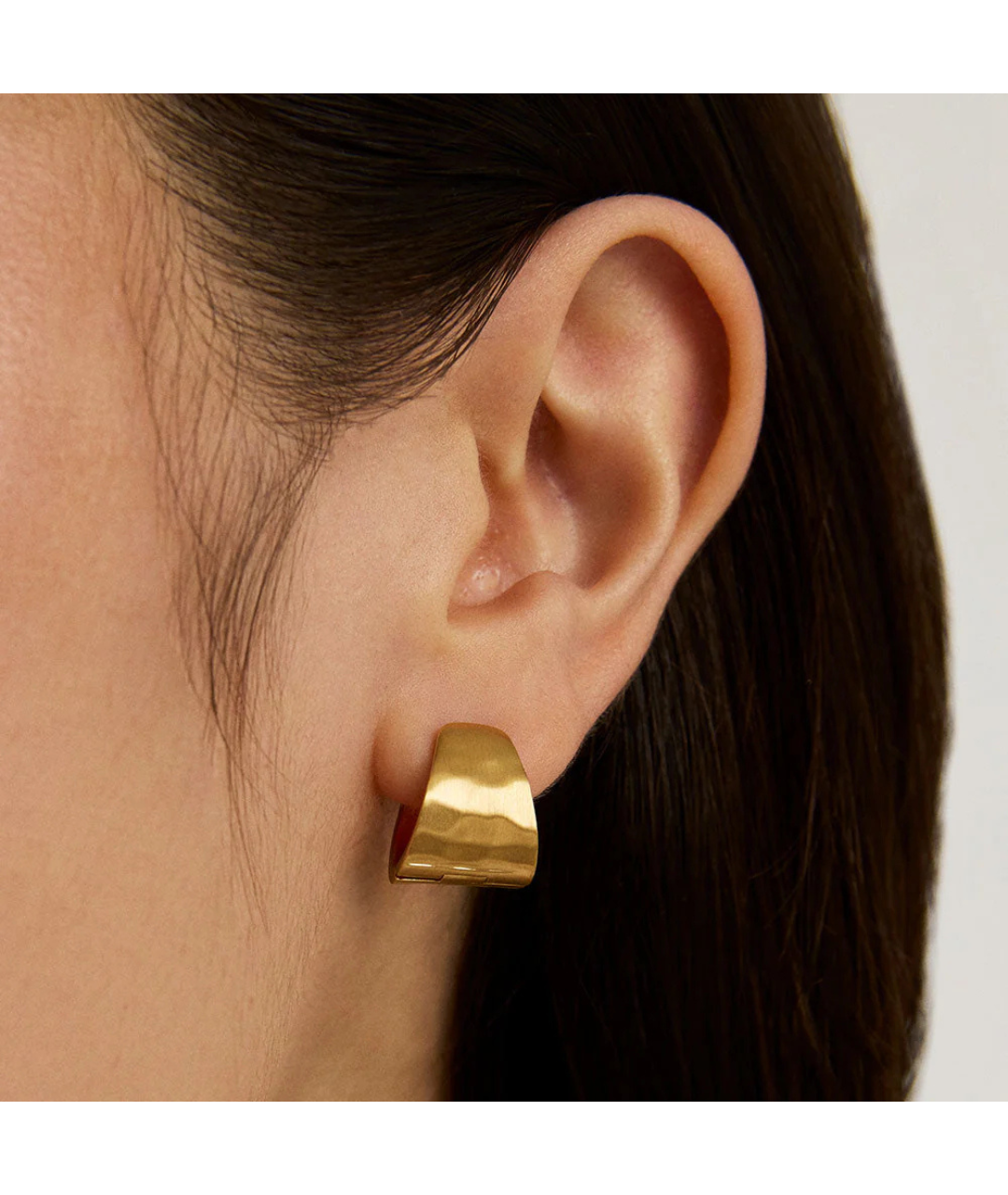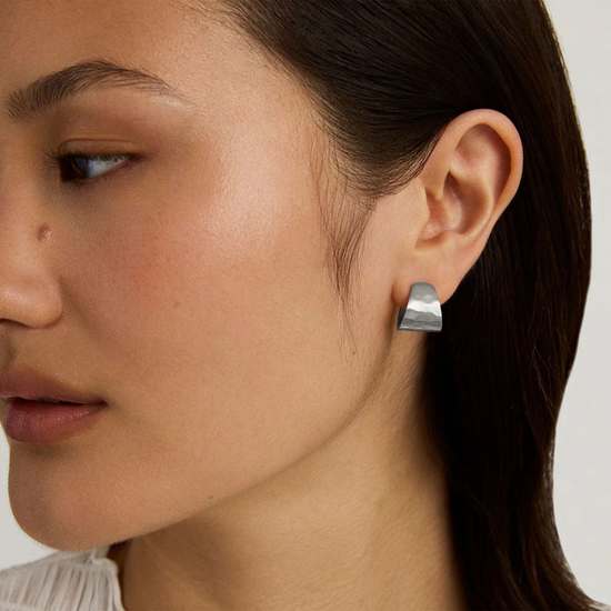 Designed with a petite-but-prominent profile, the Mara Huggie Hoops get their standout quality from a hammered finish and unique tear-drop shape that can be spotted from the side.