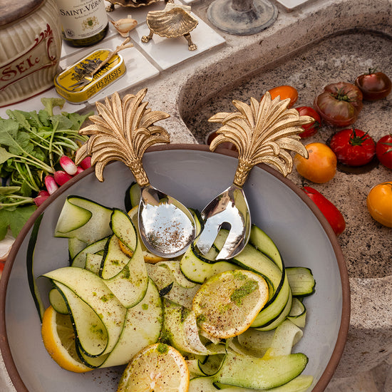 Experience the perfect blend of functionality and design with the Marlin Palm Salad Server Set. This elegant pair, featuring a handy hook to rest on your salad bowl, brings convenience and style to every meal. The fusion of durable stainless steel and rich brass, handcrafted by our artisans in India, adds a touch of sustainable luxury to your tableware collection.