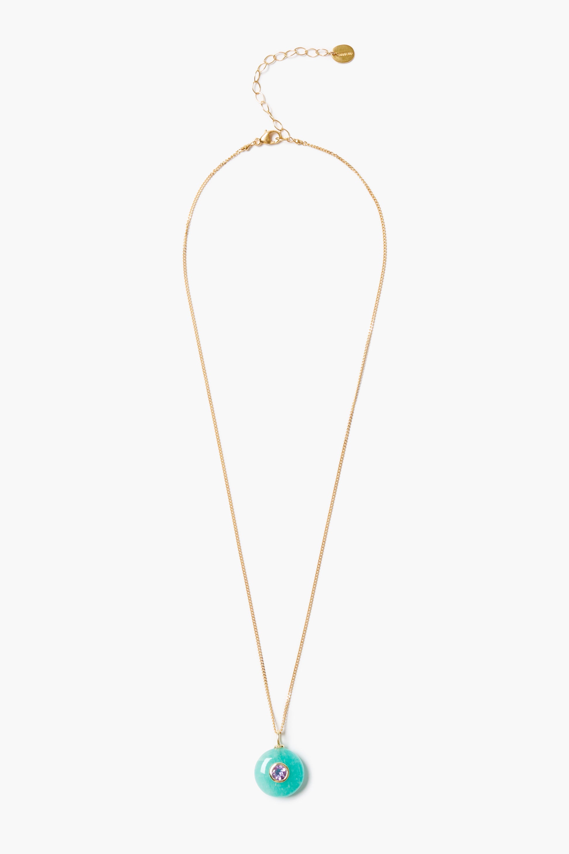 The Seed Necklace features a vibrant amazonite coin pendant with a contrasting amethyst inlay on delicate gold chain.