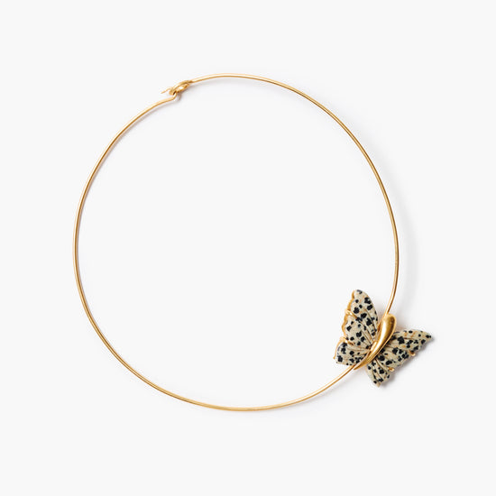 This gold collar necklace features a hand-carved Dalmatian jasper butterfly pendant and subtle hook clasp.