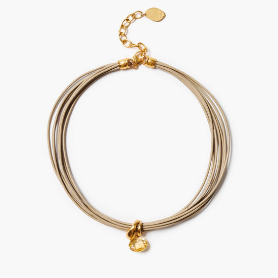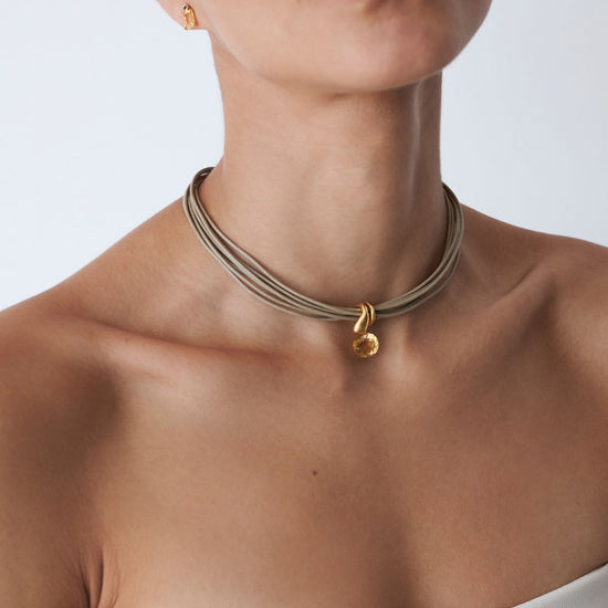 This elegant necklace features multiple leather strands gathered by a striking gold serpentine motif. The design is accented with a single citrine drop and finished with a gold lobster clasp and extender chain.