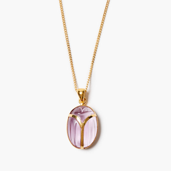 The Scarab Necklace features a beautifully hand-carved amethyst pendant set in a gold frame.