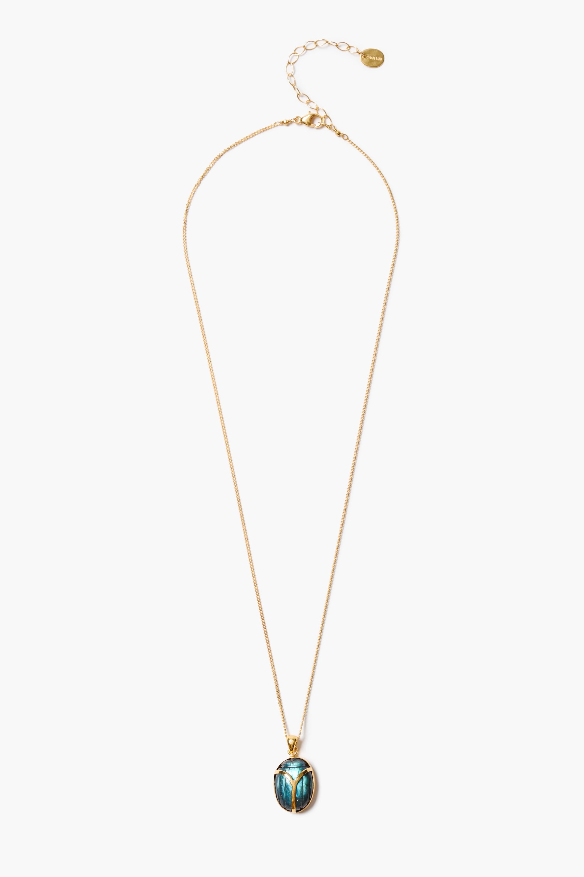 The Scarab Necklace features a beautifully hand-carved labradorite pendant set in a gold frame.