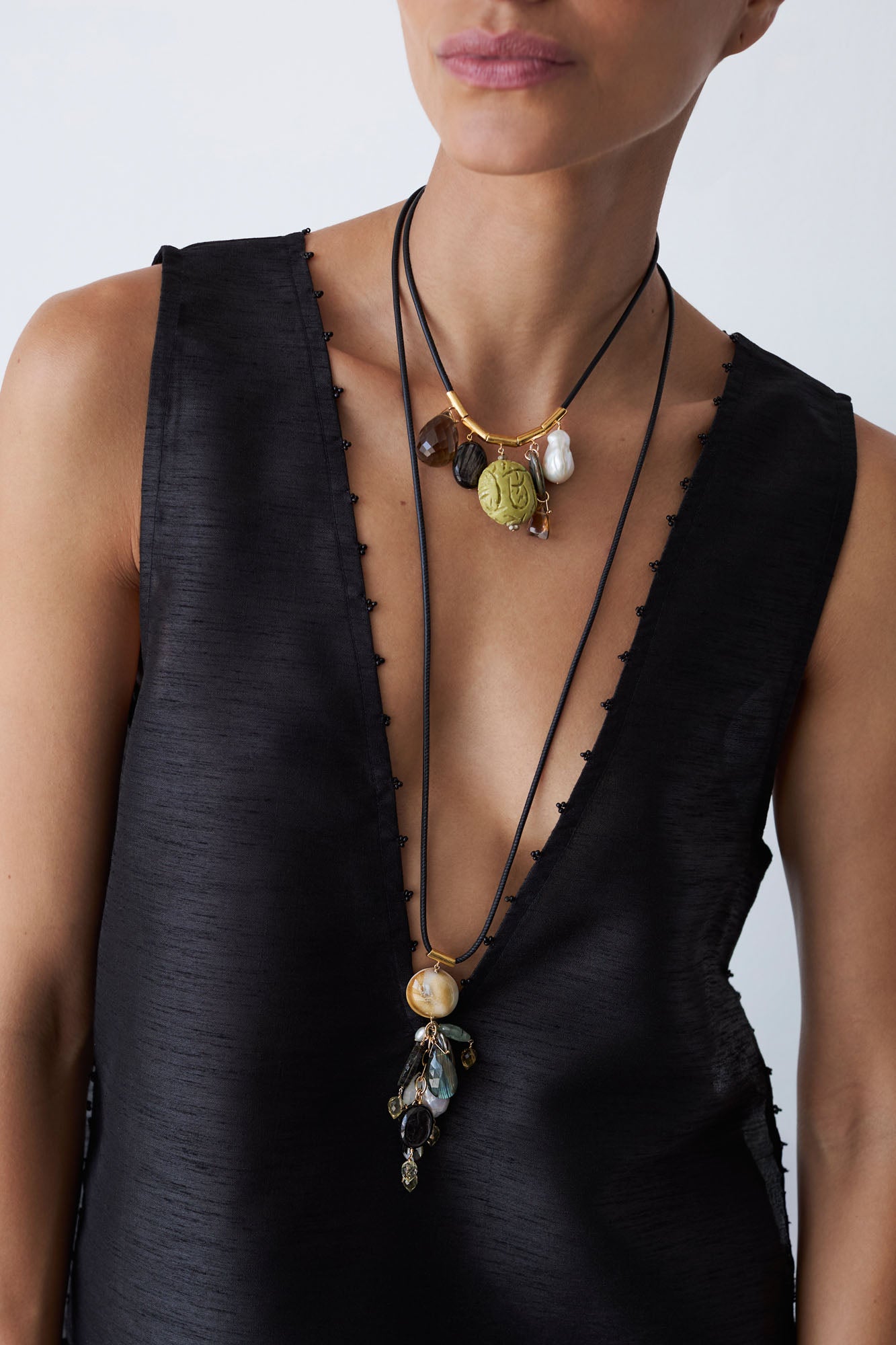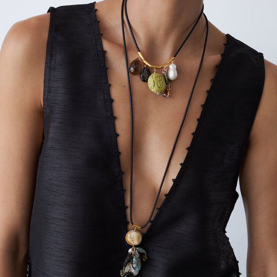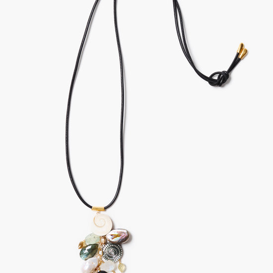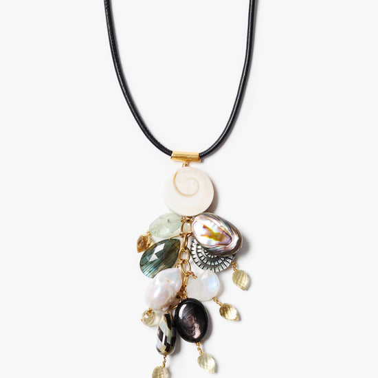 The Shiva Charm Necklace features a vibrant mix of abalone, lemon quartz, labradorite, moonstone, pearl, and prehnite suspended from a shiva shell on leather cord. Secure with a knot at desired length.