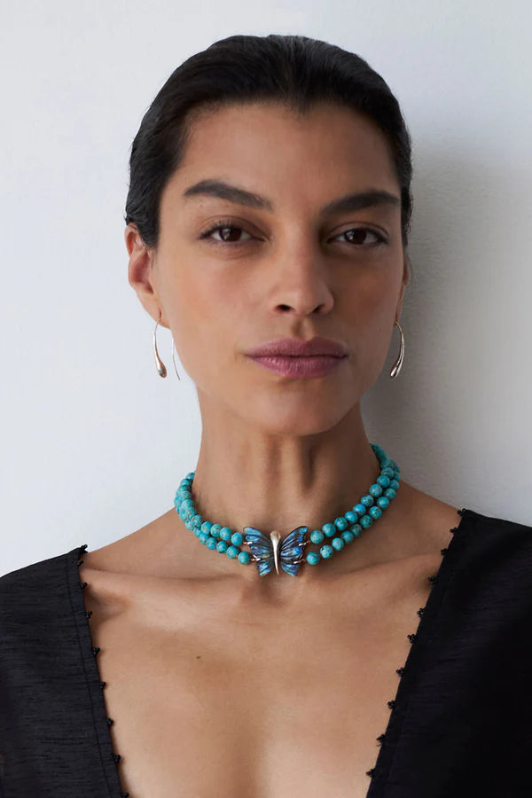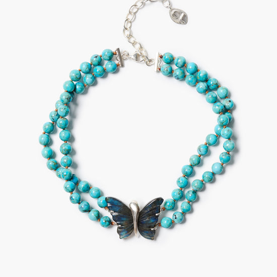 This layered collar necklace features a hand-carved labradorite butterfly pendant and turquoise beads.