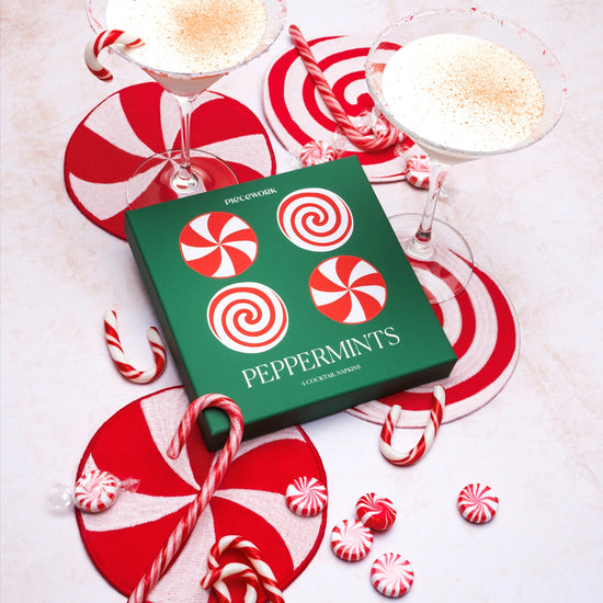 Cool, crisp, and candy-striped. These peppermint napkins bring a swirl of sweetness to your bar cart, cookie tray, or hot cocoa moment. Embroidered on 100% linen and ready to unwrap.