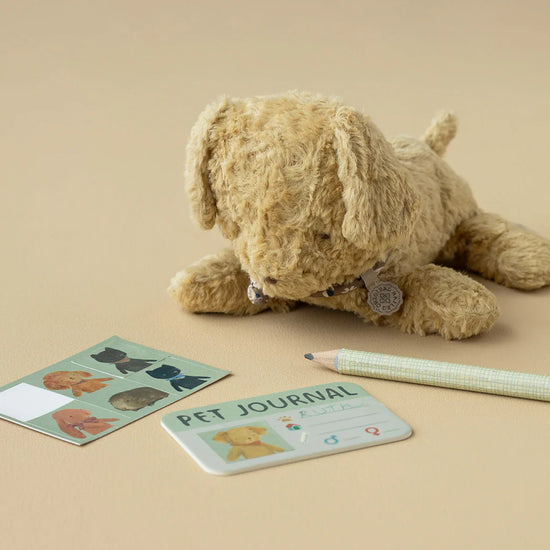 Extend playtime and take your favorite Maileg companion on every adventure. This pet carrier is thoughtfully designed with a spacious back pocket, perfect for bringing along your pet’s favourite accessories. A matching side pocket holds the included pet journal ID card, where you can write down important pet details and add one of the six included stickers, each featuring a charming drawing of a Maileg friend. Designed to fit Puppies, Dogs, Sleeping Bunnies, and Sleeping Kittens, this cosy bag ensures your special pet can travel along wherever the day leads.