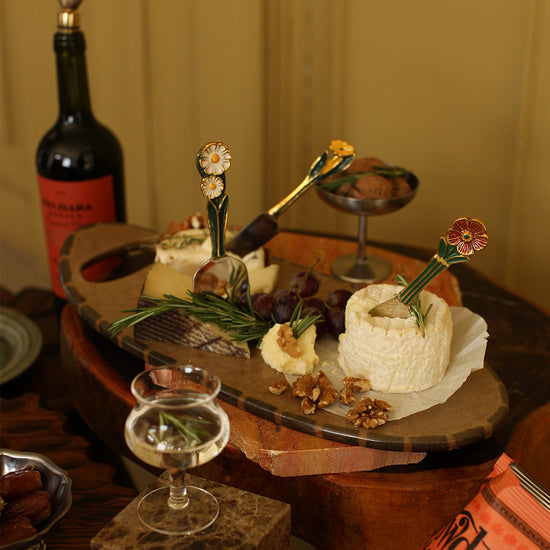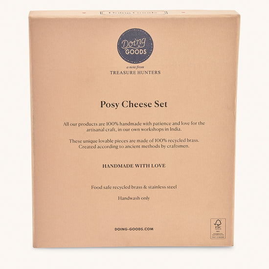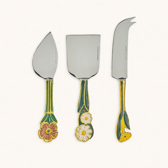 This charming set of three gold-colored cheese knives is not only functional, but also beautifully decorative with floral handles. Handcrafted from recycled brass and high-quality stainless steel, this set brings a unique and elegant touch to your table.