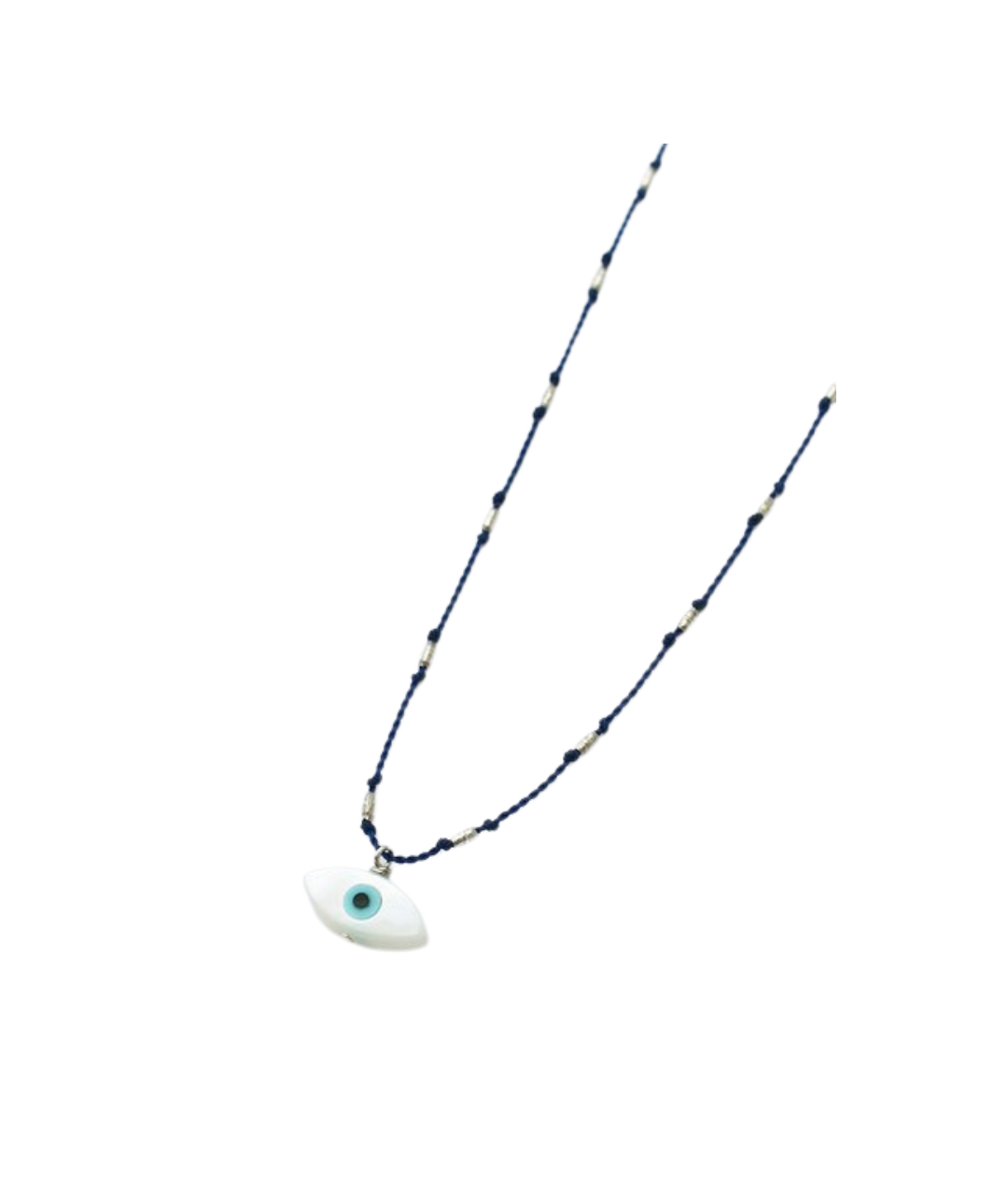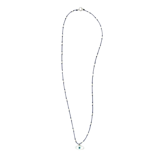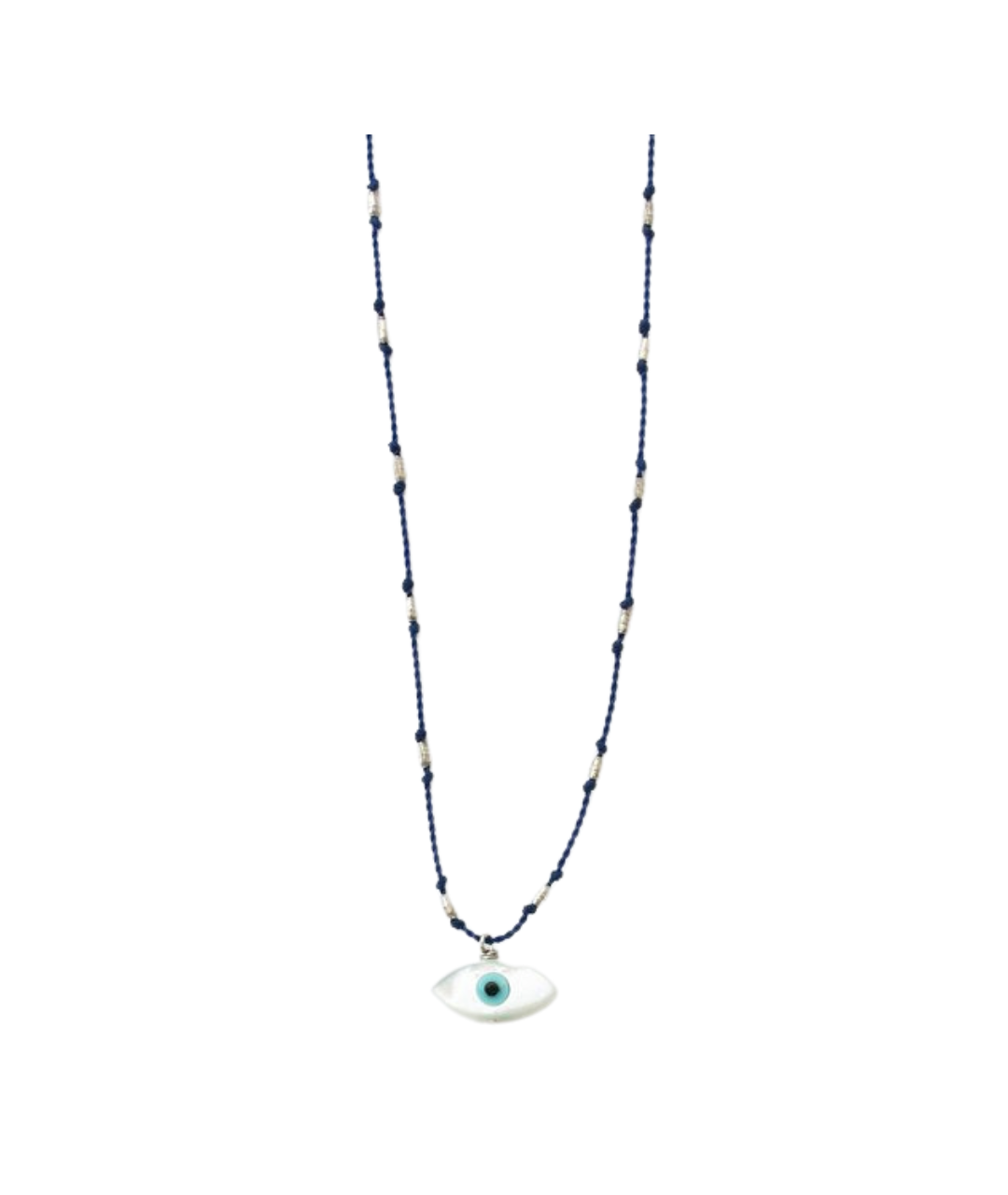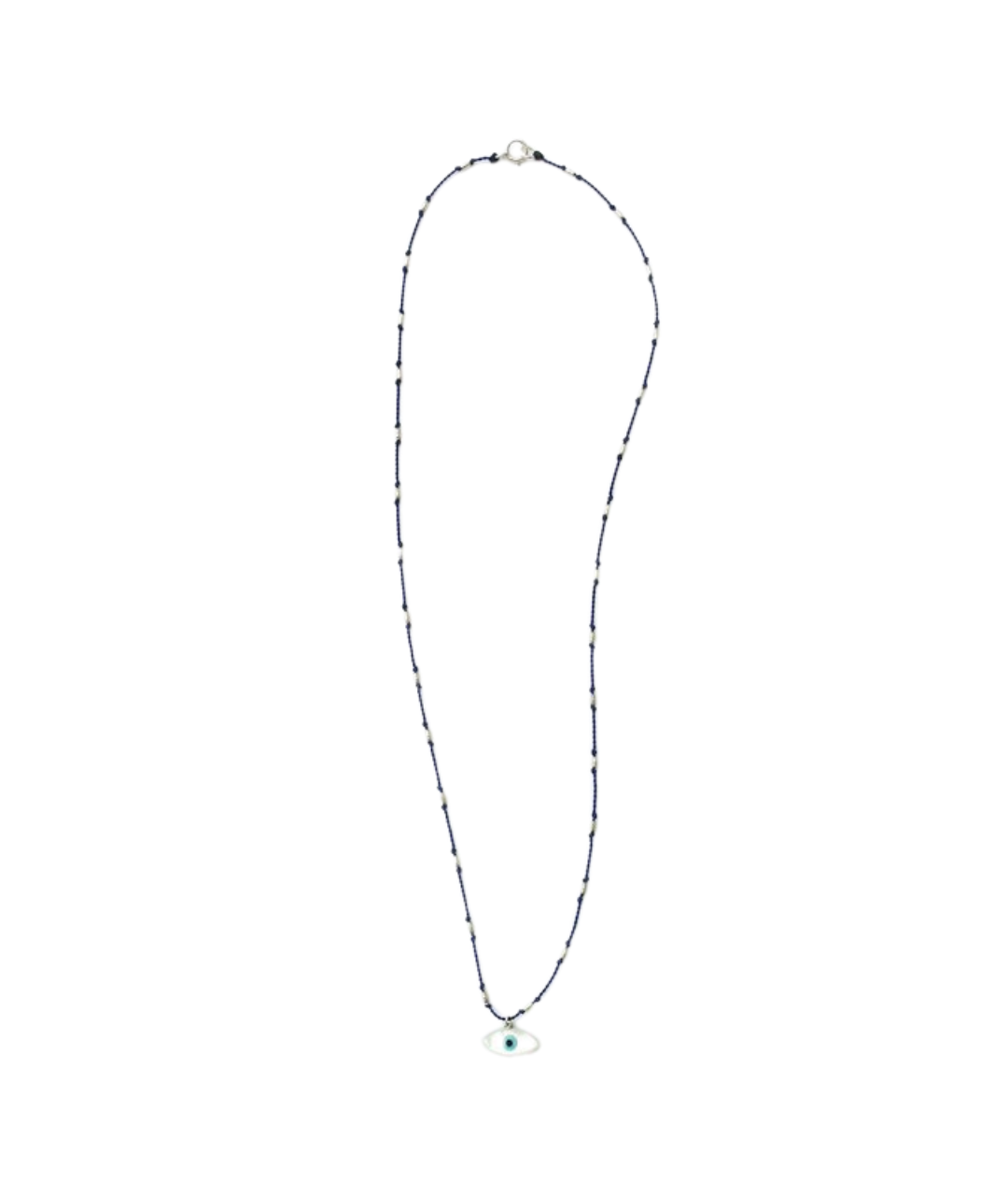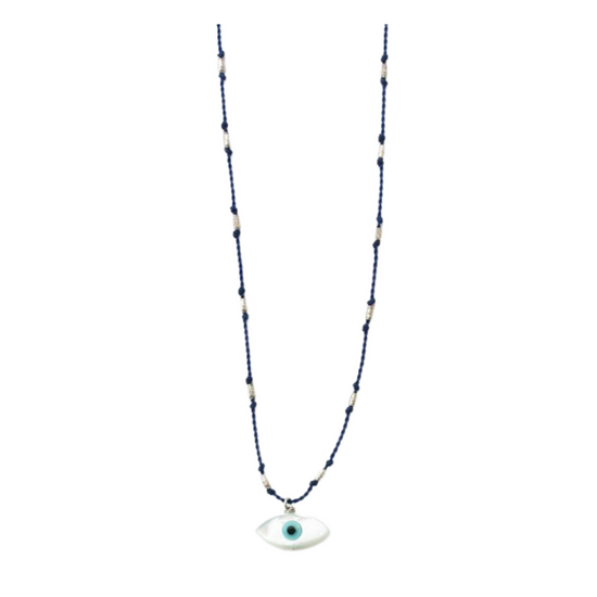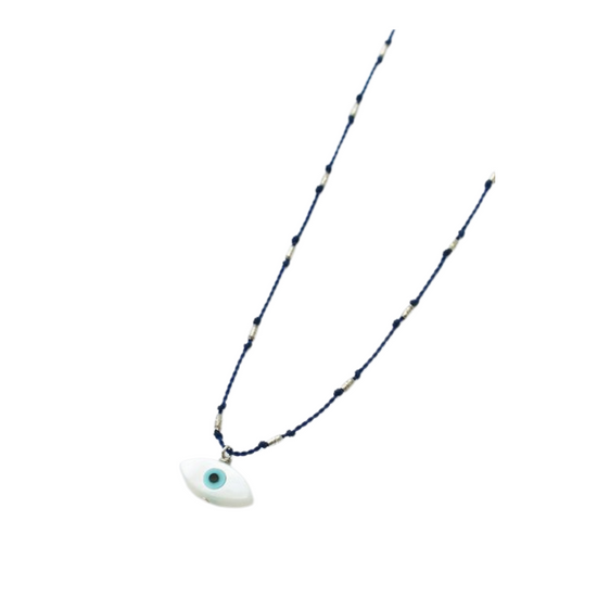 In many cultures around the world, the evil eye is believed to be a protective amulet, warding off harm and evil. This evil eye is made of mother of pearl and measures 6mm x 12mm. It sits on a nylon cord, knotted with Sterling silver rice beads. The cord is water proof and very durable, so you never have to take it off.