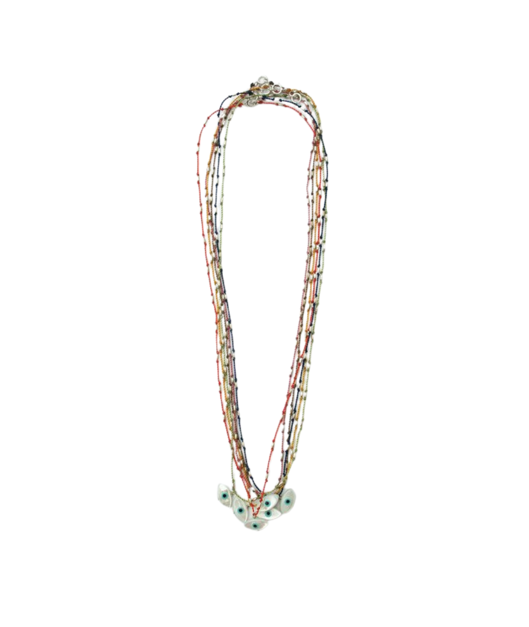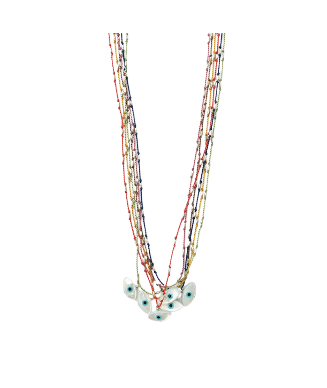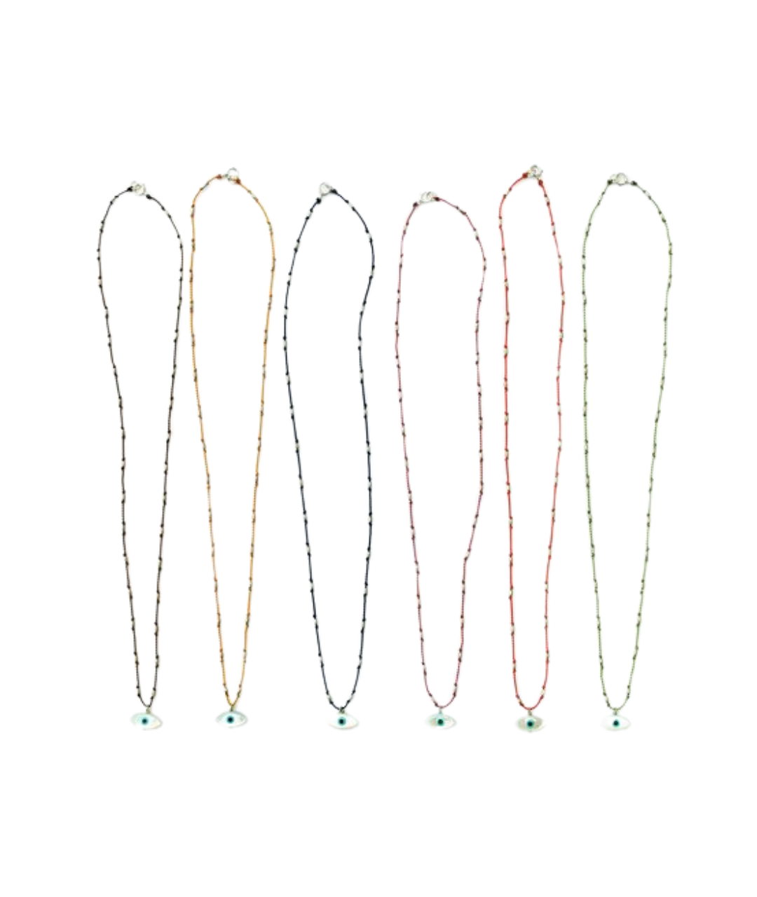In many cultures around the world, the evil eye is believed to be a protective amulet, warding off harm and evil. This evil eye is made of mother of pearl and measures 6mm x 12mm. It sits on a nylon cord, knotted with Sterling silver rice beads. The cord is water proof and very durable, so you never have to take it off.