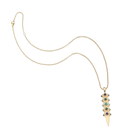 The Sun - the ultimate guiding star. The sun has been a symbol of life and strength in many cultures throughout history, so we encompassed the energy from its rays into a pendant. Embellished with a collection of cabochon stones, this pendant is sure to grant you the strength to face any challenge, and the good fortune to guide you toward brighter days.