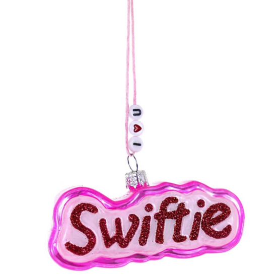 Celebrate your love for all things Swiftie with this sparkly pink ornament! Adorned with dazzling glitter and a bold declaration, it's a must-have for fans.