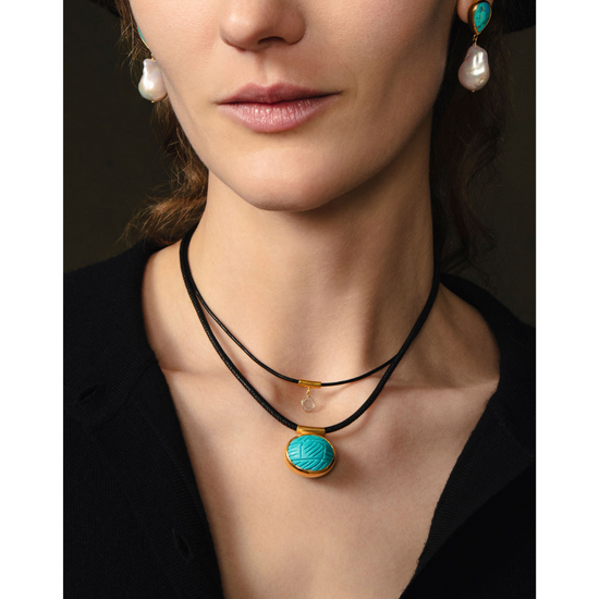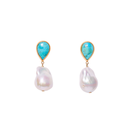 18k gold plated sterling silver post back earrings featuring turquoise tear drops and freshwater baroque pearls. 1 1/2in drop.