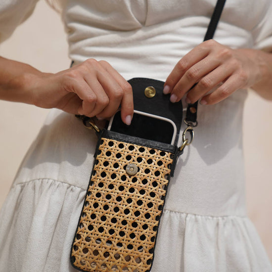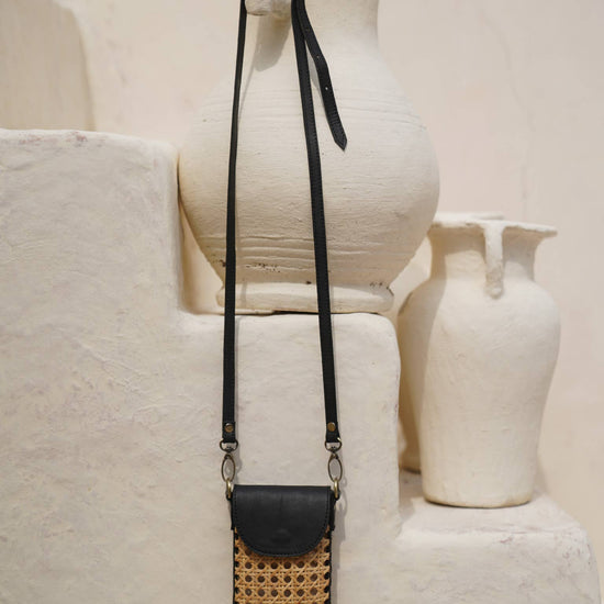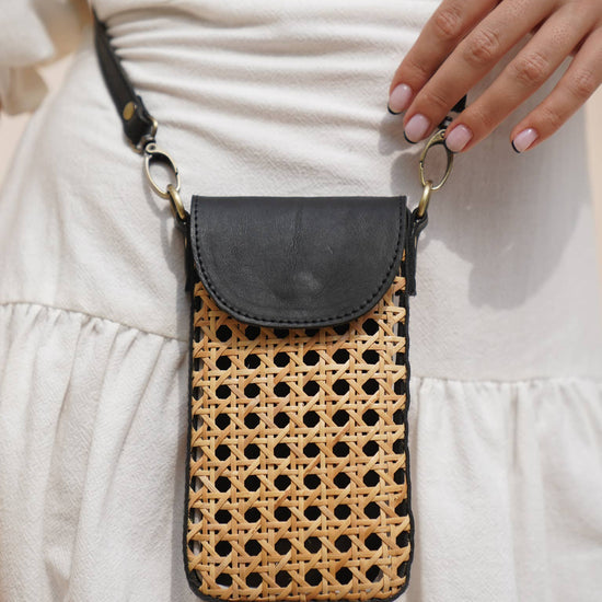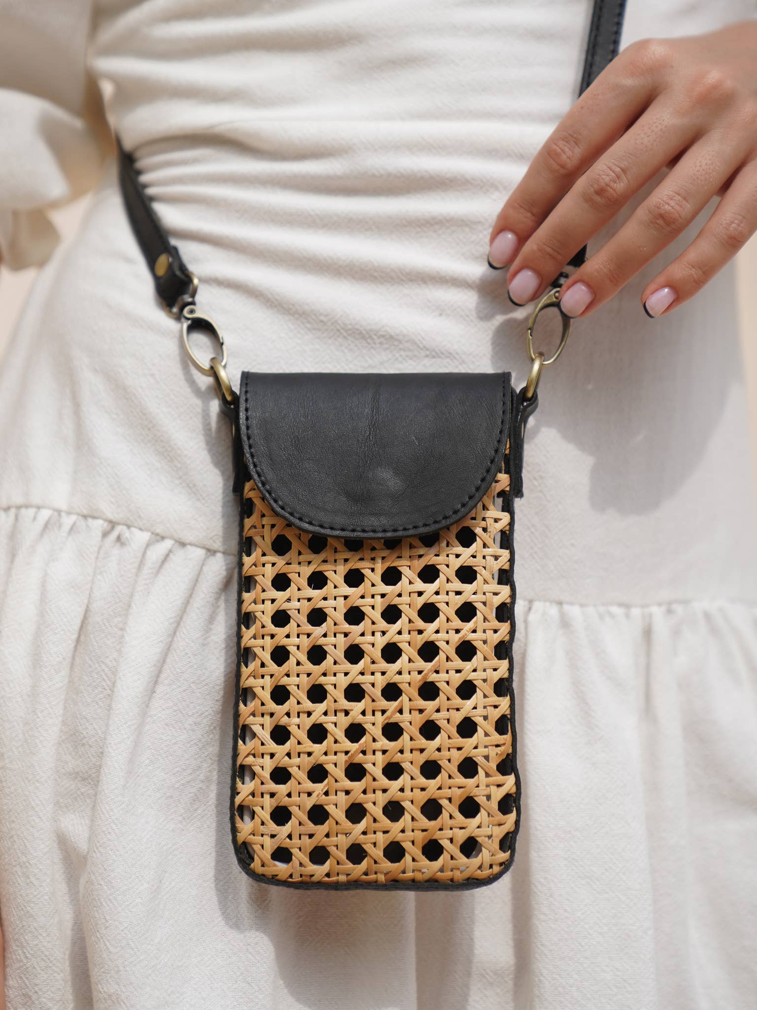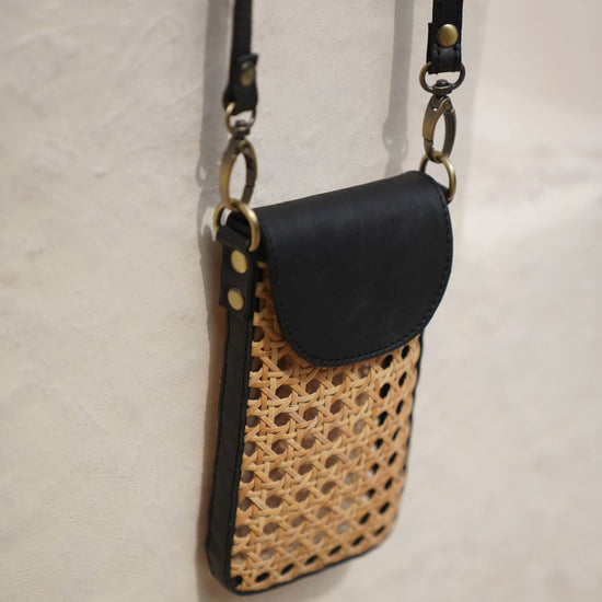 Elevate your everyday essentials with this handcrafted rattan phone case, blending timeless style with practicality. Featuring a sleek black leather flap and strap, this crossbody design keeps your phone secure and within easy reach. The intricate rattan weave adds a natural charm, while the compact size makes it perfect for on-the-go lifestyles.