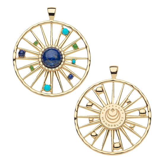 A new take on the sun's rays, this cutout celestial pendant is adorned by Lapis, Turquoise and Green Tourmaline.